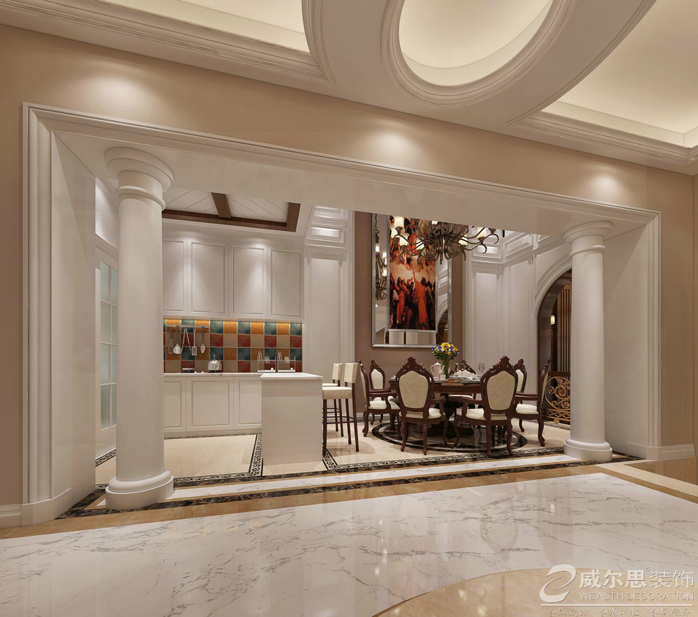 會客餐廳一體式設(shè)計,相互連通又相互獨(dú)立,圓形餐桌的設(shè)置,避免了互相干擾及狹長的空間,中式古典元素,恰到好處的點(diǎn)綴,合理的安排會客廳、餐廳、廚房使用空間,使之便利日常生活,更增加家庭的凝聚力。
